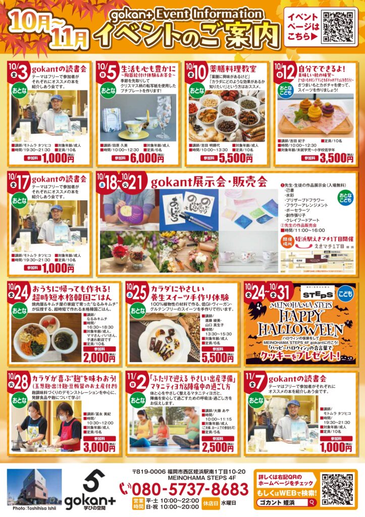 先生・生徒の作品展示や先生の作品が購入できる販売会を開催致します。またキッズ向けのイベントとしてMEINOHAMA STEPSと連携した「ハロウィン企画」も期間限定で開催。ハロウィーンの衣装を着てgokantで元気に「ハッピーハロウィン」の合言葉を言おう!!
