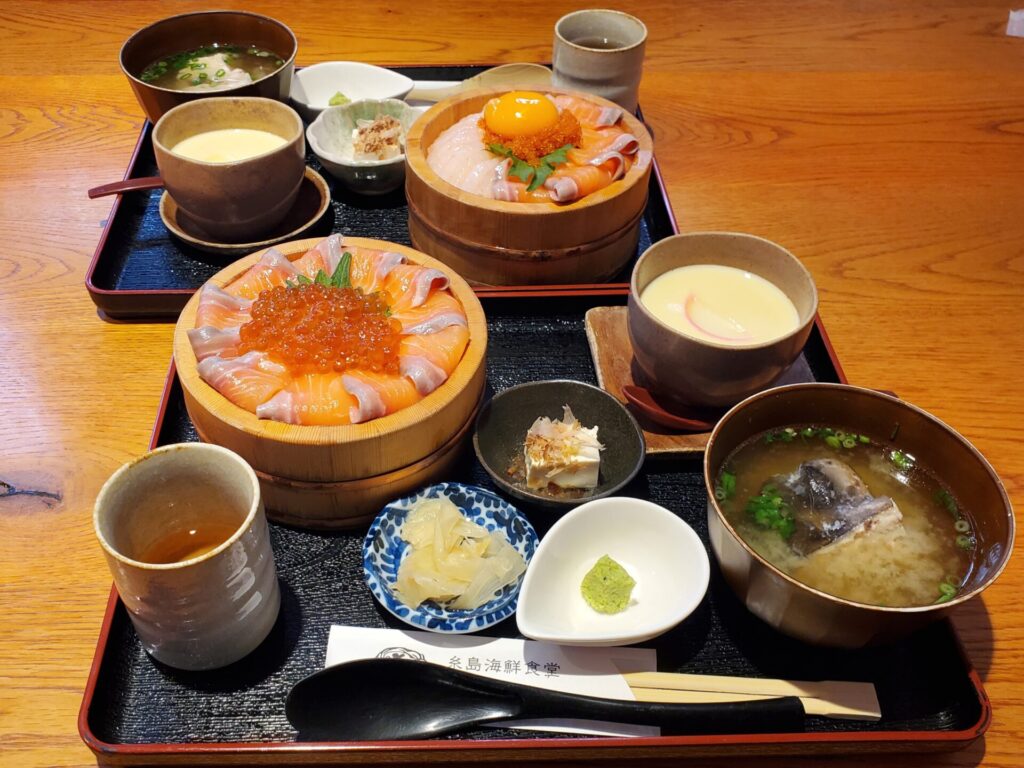ランチでサーモンいくら丼を注文しました。鯛の味噌汁や茶碗蒸しもついてとても豪華で、魚も新鮮で美味しかったです。糸島だと行列ですが、特に並んだりもなかったので穴場だと思います!