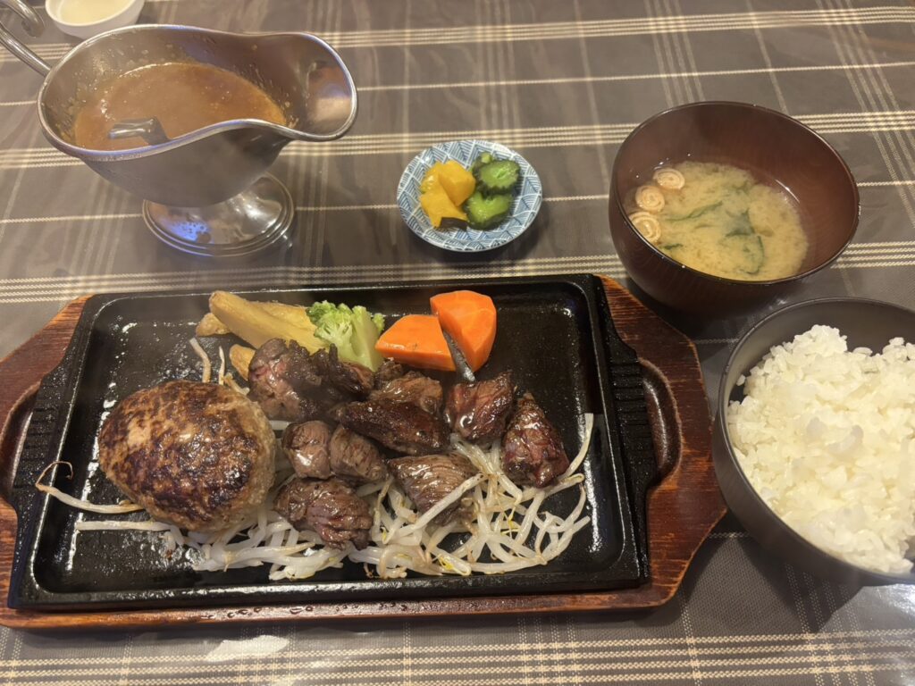 ランチにおすすめのメニューは、サイコロステーキ80gとハンバーグ100gが両方とも味わえる『スペシャルコンビセット』(¥1,690)。