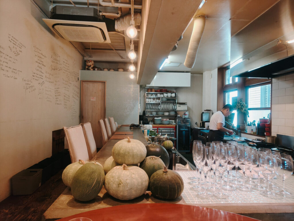 シンプルながら洗練された雰囲気の店内は、全部で16席。カウンター席とテーブル席があり、友人同士や家族との食事はもちろん、一人で気軽に訪れるのも◎。