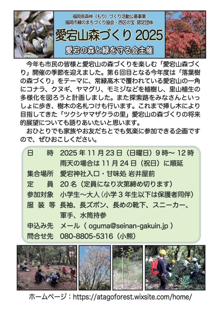 | 問い合わせ | 080-8805-5316(小熊) oguma@seinan-gakuin.jp ※ボランティア保険を掛けますので事前連絡が必要です。 |